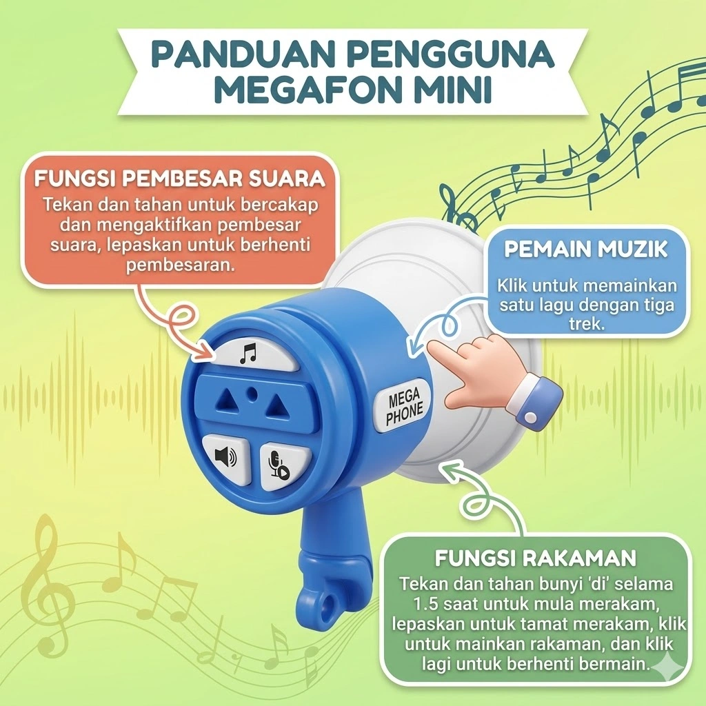 ✅ Boleh rakam dan ulang semula suara dengan hanya satu klik ✅ Fungsi pembesar suara untuk suara lebih kuat & jelas ✅ Mudah digunakan – tekan, rakam & main semula ✅ Dilengkapi 3 pilihan muzik untuk hiburan tambahan ✅ Saiz kecil & portable – mudah dibawa ke mana-mana ✅ Sesuai untuk kegunaan di rumah, bersama keluarga & anak-anak